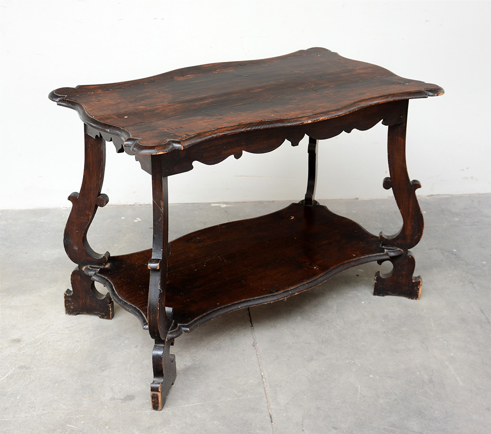 Tavolo in legno dolce a tinta scura con piani mossi e gambe sagomate (cm...