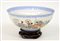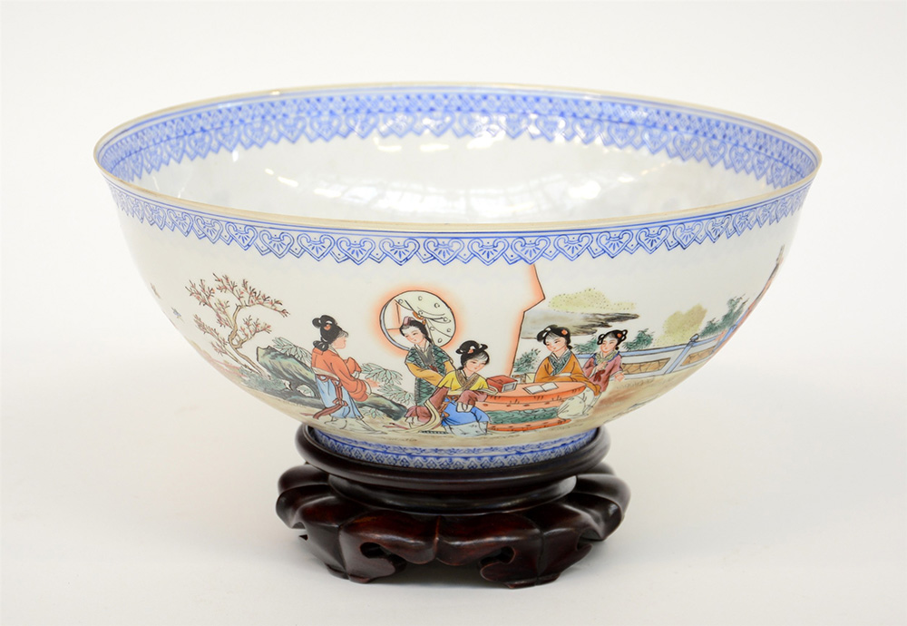 Ciotola in porcellana a guscio d'uovo decorata con figure femminili, base in legno, custodia originale (difetti)