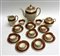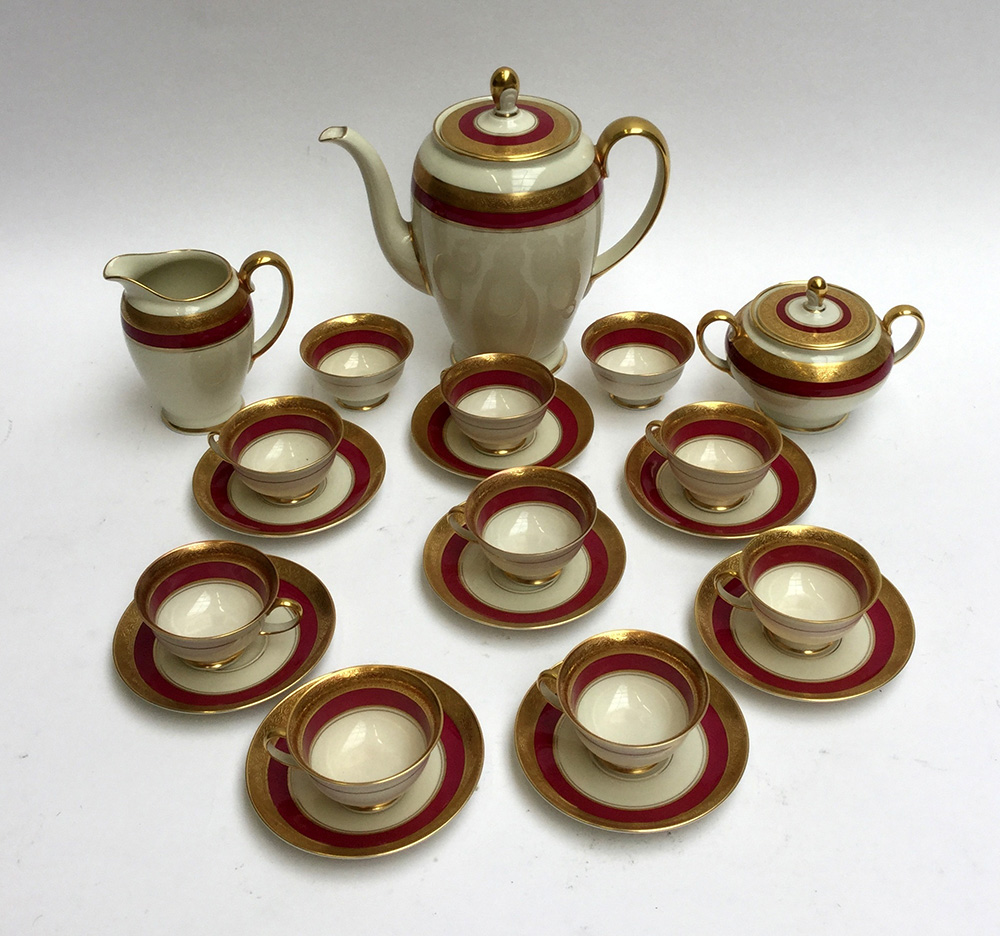 Manifattura di Rosenthal, servizio da caffè in porcellana decorata con profili oro e porpora su fondo crema composto da caffettiera, lattiera, zuccheriera e dodici tazzine con undici piattini (difetti)