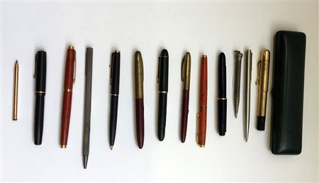 Lotto composto da tredici penne (stilografiche, biro e portamine) alcune con lamina dorata (difetti e mancanze)