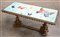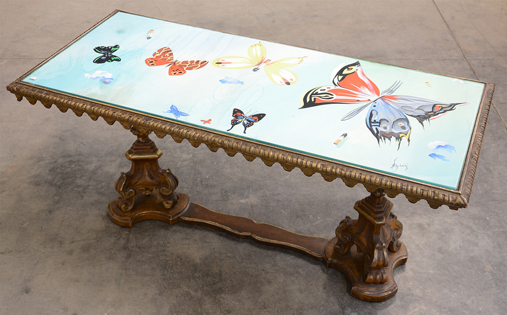 Lotto composto da un tavolino da salotto (cm 105x49x47) in forma rettangolare con sostegni in legno intagliato, laccato e dorato e piano in vetro con inserita una tecnica mista su carta (cm 42x100) firmata Regianini e un'altra tecnica mista su carta (cm 42x100) raffigurante pesci a firma Regianini.