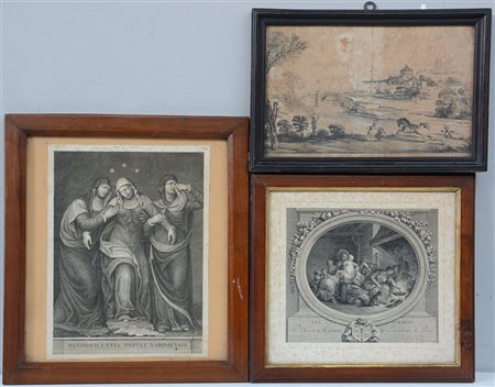 Lotto di tre incisioni del secolo XVIII, soggetti e misure diverse, in...