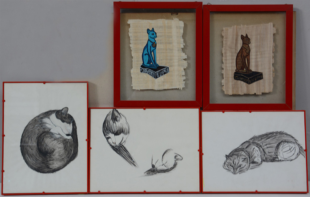 Gruppo di cinque cornici laccate rosso contenenti immagini di Felini, misure...