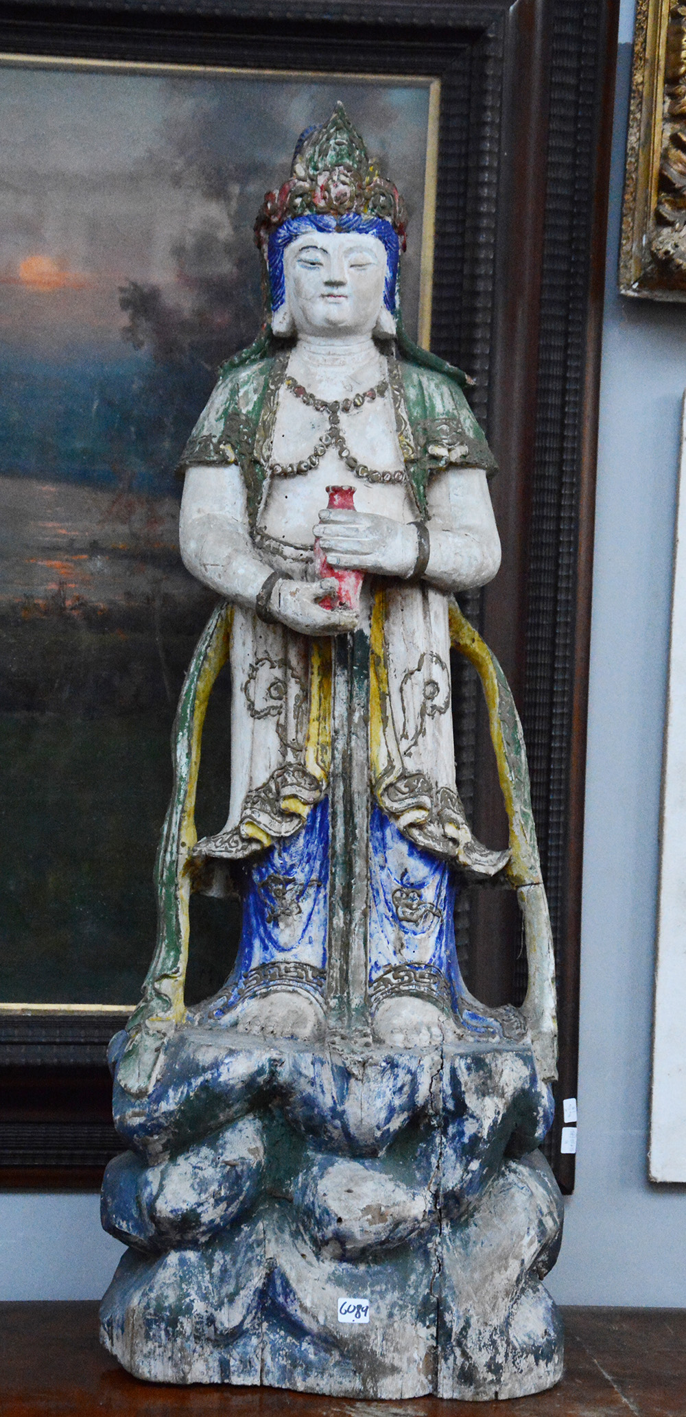 Scultura in legno raffigurante guanyin stante su base rocciosa decorata in policromia (difetti)