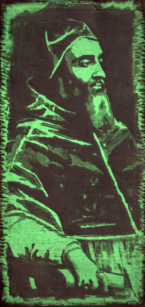 Raimondo Galeano PAPA CLEMENTE VII Smalto fluorescente su arazzo, cm 100x70. Opera eseguita nel 2005. Firma e titolo sul retro. Opera accompagnata da certificato di autenticità su foto rilasciato dalla Galleria Il Ponte (Roma). Prov. Galleria Il Ponte (Roma). Ivi acquisito dall'attuale proprietario.