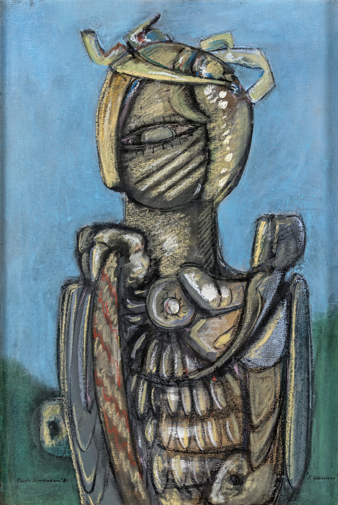 Placido Scandurra IL GUERRIERO Tecnica mista su carta applicata su tela. Opera del 1981. Firma sul fronte e sul retro.
