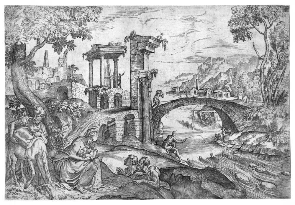 degli Angeli Giovanni Battista detto Torbido del Moro RIPOSO DURANTE LA FUGA IN EGITTO Acquaforte e bulino. mm 235x344. TIB 32/16, 3. Firmata sulla lastra. Esemplare recante la dicitura “Apud Camocium” non descritta da Bartsch. Bellissima impressione stampata su carta vergellata con filigrana “Cerchio su lettere SP”. Rifilata sull’impronta della lastra, reintegro all’angolo inferiore destro, piega verticale centrale appena visibile.