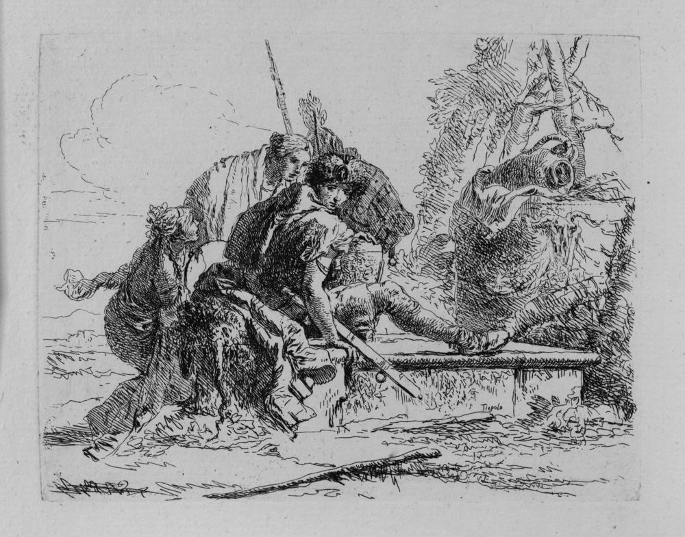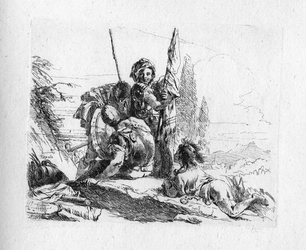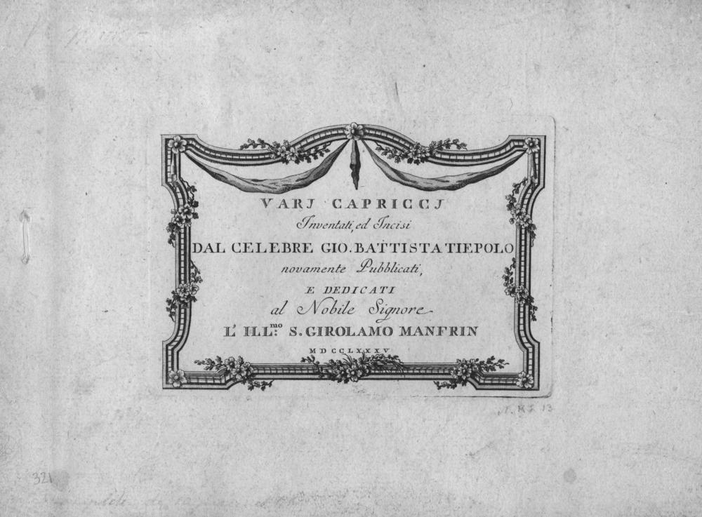 Tiepolo Giovanni Battista VARJ CAPRICCI Serie completa ed omogenea di 10 acqueforti e un frontespizio. De Vesme, 3/10. Rizzi, 29/38. Succi, 41/50. Datata “1785” sul frontespizio recante la dedica a Girolamo Manfrin. Pubblicati da Anton Maria Zanetti nella seconda edizione della “Raccolta di chiaroscuri”, i “Capricci” furono editi autonomamente una sola volta con le tavole nello stato unico ed il frontespizio qui descritto. La datazione della serie è ancora fonte di dibattito; Rutgers la colloca fra il 1733 ed il 1735. Bellissime impressioni stampate su carta vergellata con parte di filigrana “R” (su un solo foglio). Grandi margini. Lievi tracce d’uso. Raccolte con un punto di cucitura al margine sinistro.
