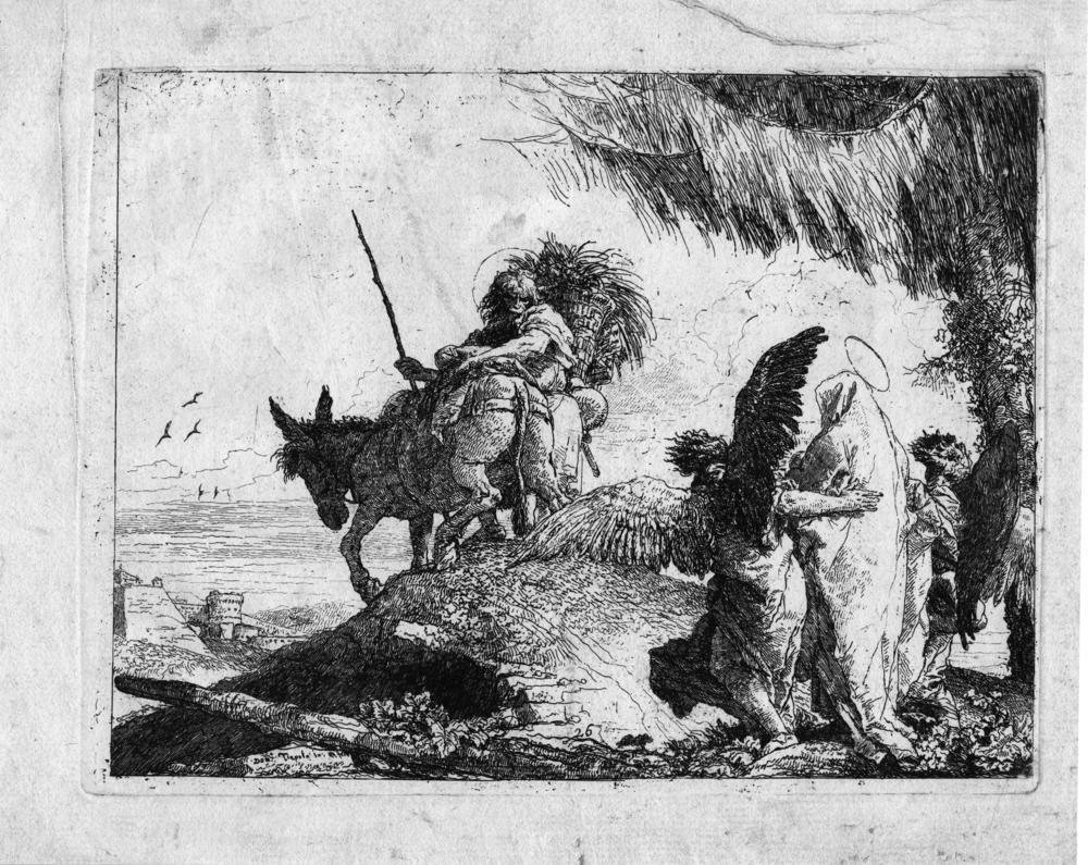 Tiepolo Giandomenico MARIA SOSTENUTA DA DUE ANGELI SEGUE GIUSEPPE Acquaforte e bulino. mm 189x249. De Vesme, 26. Rizzi, 92. Succi, 67. Firmata in basso a sinistra. sulla lastra. Ventiseiesima tavola da Idee pittoresche sopra la fuga in Egitto. III stato su 3 dopo la numerazione e la riduzione della lastra. Ottima impressione stampata con nitida e brillante inchiostrazione su carta vergellata. Grandi margini, due leggere pieghe ai margini fuori dall’area incisa.