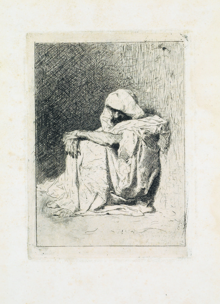Fortuny Y Marsal ÁRABE SENTADO Acquaforte. mm 138x102. Foglio: mm 280x210. Vives/Cuenca, 7. Rara prova in uno stato intermedio fra il I ed il II su 2 prima del rinforzo nell’ombreggiatura e del grafismo sotto il monogramma ma con l’ombreggiatura intorno ai piedi della figura. Esemplare antecedente alla prima edizione del 1873. Bellissima impressione stampata con velatura per campiture e segno nitido. Grandi margini, una piega orizzontale al margine superiore, tracce di pieghe minori, un alone di umidità al margine destro fuori dalla parte incisa, lievi e sporadiche fioriture.