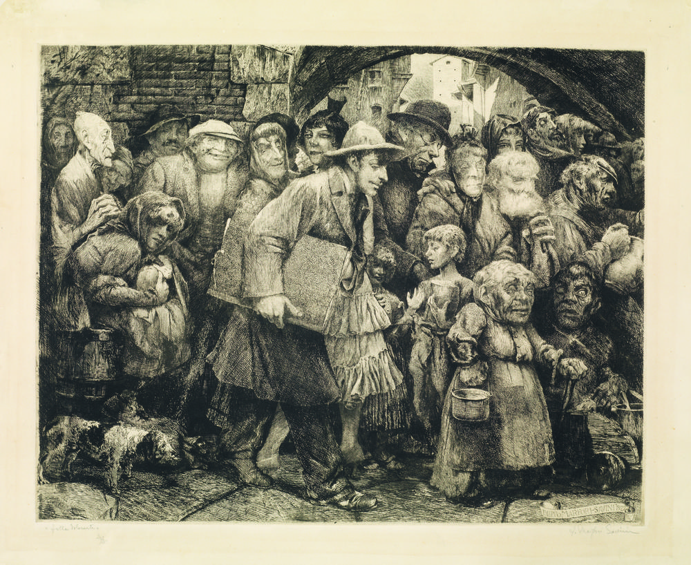 Marfori Savini Filippo FOLLA DOLORANTE. 1927 Acquaforte. mm 417x520. Foglio: mm 503x620. Firmata e titolata a matita e numerata “24/30”. Firmata e datata sulla lastra. Rara incisione nota anche con i titoli “Tipi di dolore” e “La corte dei miracoli” con cui fu identificato l’esemplare esposto alla Biennale dell’Incisione di Firenze del 1927. Ottima impressione stampata con segno nitido e brillante su carta avana pesante. Grandi margini, tracce lievi di ossidazione da vecchio ”passe-partout” e di vecchio incollaggio al ”verso”.