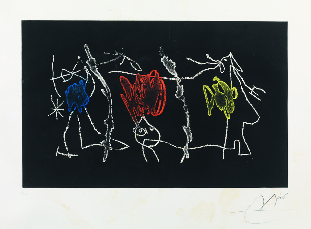 Mirò Joan NOCTURN CATALA. 1972 Acquaforte e acquatinta a colori. mm 295x471. Foglio: mm 560x7650. Dupin, 558. Firmata a matita e numerata “45/75”. Stampata a Barcellona da Poligrafa Éditeur per Arte Adrien Maeght. Unica tiratura a 75 esemplari firmati e numerati. Bellissimo esemplare stampato su carta “BFK RIVES”. Grandi margini editoriali.