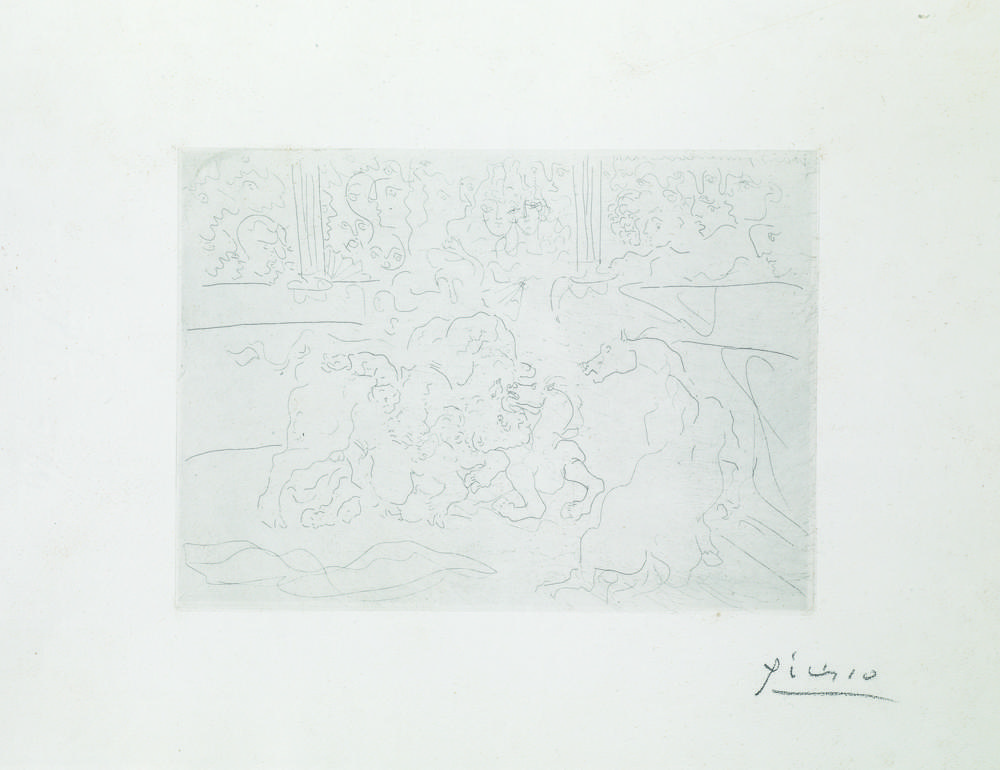 Picasso Pablo TAUREAU ET CHEVAUX DANS L’ARÈNE. 1933 Acquaforte su rame mm 192x266. Foglio: mm 345x445. Baer/Geiser, 380. Firmata a matita e datata in controparte sulla lastra “Paris 7 novembre XXXIII”. Tavola nel II stato su 2 per la “Suite Vollard” stampata da Lacourière nel 1939 per Edition Vollard. Bellissima impressione stampata su carta vergellata “Montval” con filigrana “Picasso”. Grandi margini editoriali, ottima conservazione