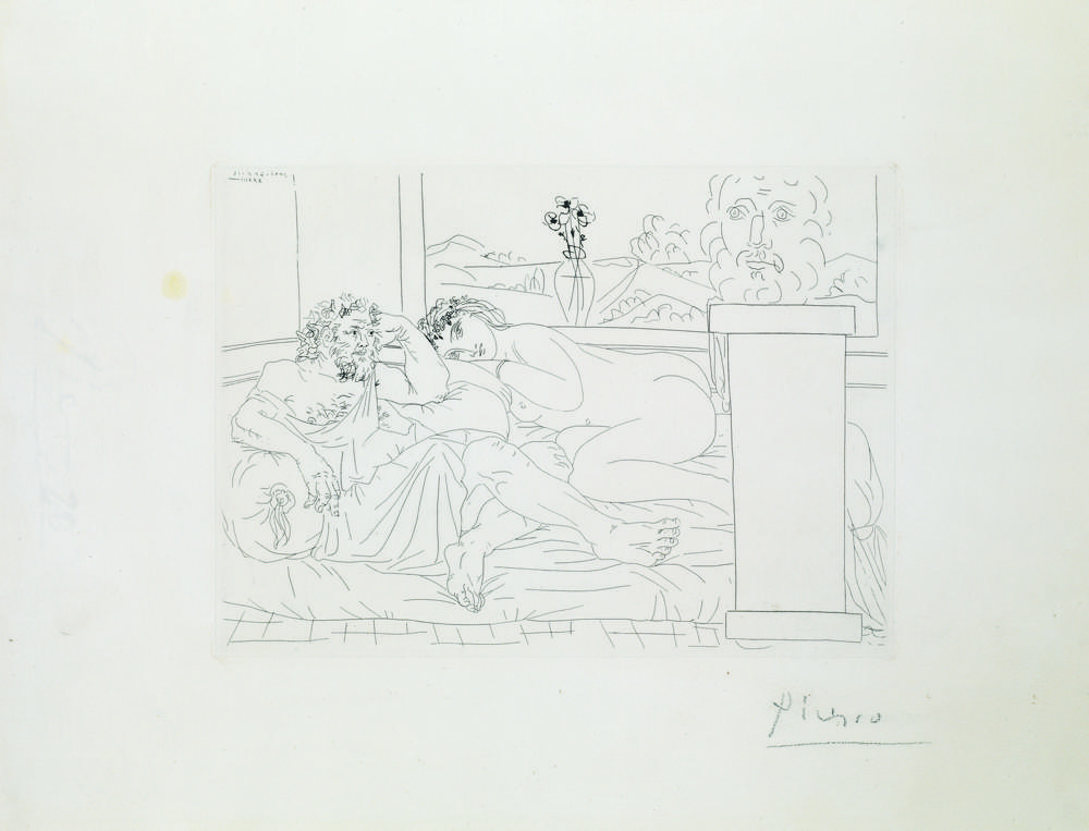 Picasso Pablo LE REPOS DU SCULPTEUR IV. 1933 Acquaforte su rame mm 191x265. Foglio: mm 342x445. Baer/Geiser, 327. Firmata a matita e datata in controparte sulla lastra “4 avril, Paris XXXIII”. Tavola nel II stato su 2 per la “Suite Vollard” stampata da Lacourière nel 1939 per Edition Vollard. Bellissima impressione stampata su carta vergellata “Montval” con filigrana “Picasso”. Grandi margini editoriali, due lievi macchie al margine sinistro fuori dall’area incisa.