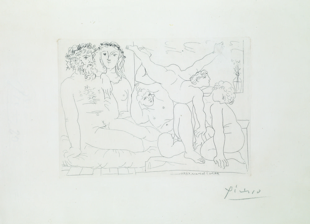 Picasso Pablo FAMILLE DE SALTIMBANQUES. 1933 Acquaforte su rame mm 190x263. Foglio: mm 343x445. Baer/Geiser, 316. Firmata a matita e datata in controparte sulla lastra “Paris 30 mars XXXIII”. Tavola nel II stato su 2 per la “Suite Vollard” stampata da Lacourière nel 1939 per Edition Vollard. Bellissima impressione stampata su carta vergellata “Montval” con filigrana “Picasso”. Grandi margini editoriali, una leggera piega di stampa all’angolo superiore destro.