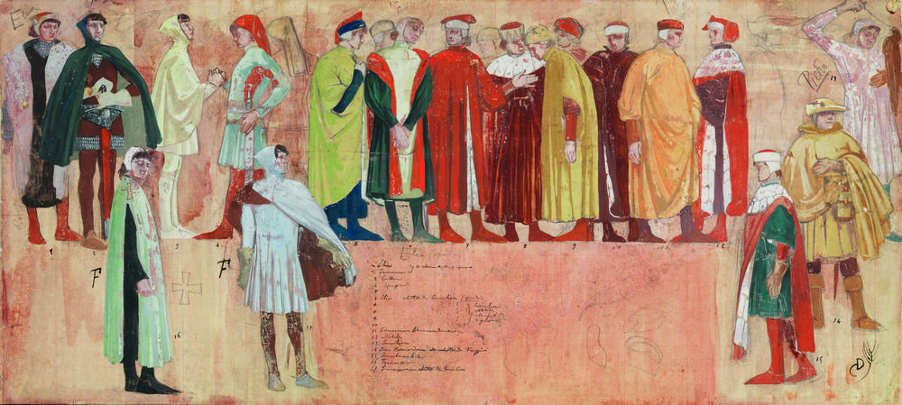 Cambellotti Duilio TEORIA DI PERSONAGGI IN COSTUME Tempera policroma, matita di gra te e penna nera, quadrettato a matita rossa su carta millimetrata. mm 318x720. Monogramma con la spiga apposto a penna nera. Variopinta rassegna di personaggi e notabili, tutti identificati in una legenda apposta al centro della composizione, protagonisti della biografia di San Francesco d’Assisi prima della conversione, al suo ritorno dalla prigionia conseguita alla guerra fra Assisi e Perugia. La quadrettatura e l’impianto lasciano supporre che si tratti di un bozzetto per un affresco di ignota collocazione.