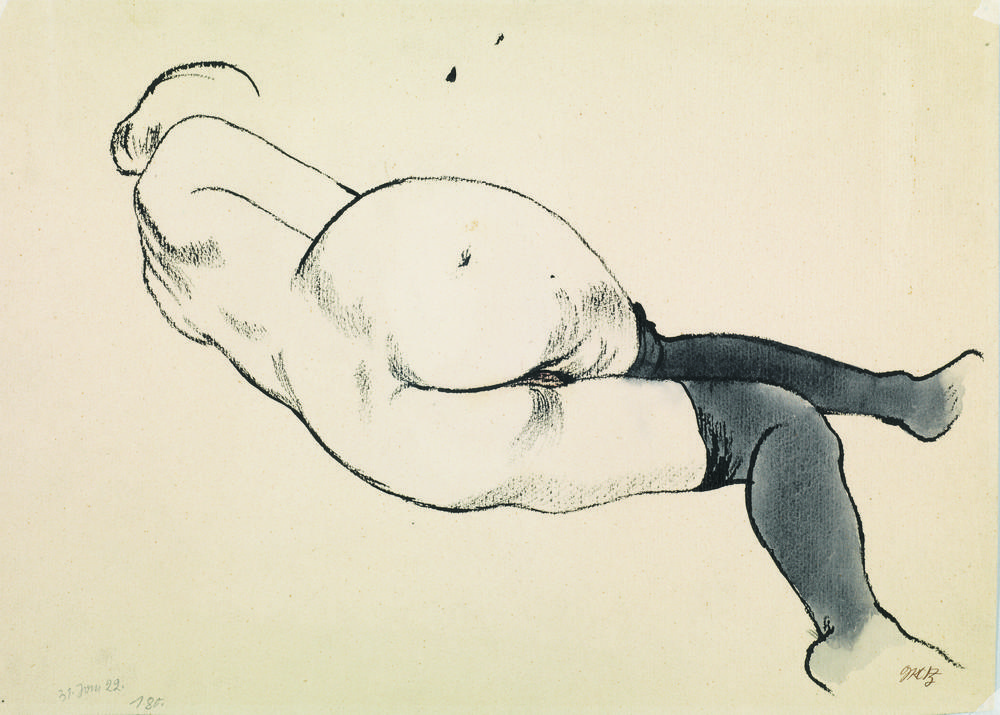 Grosz George AKT MIT STRU¨MPFEN Inchiostro nero e acquerello grigio su carta avana pesante. mm 281x394. Firmato a penna e datato a matita "31.Jan.22". Titolo a matita al verso. Al verso: "Madre e figlio". Inchiostro nero. Timbro al verso del George Grosz Nachlass con il numero "1.22.9".