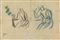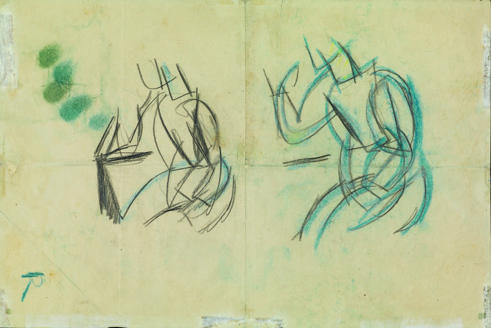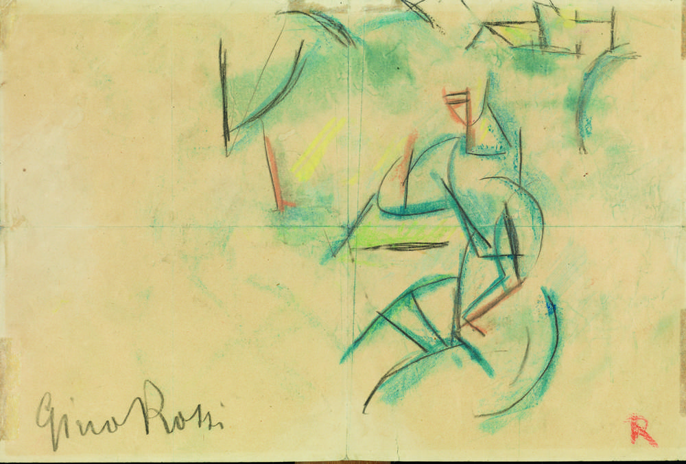 Rossi Gino FIGURA FEMMINILE Matita nera e pastello policromo su carta. mm 205z310. Firmato a matita e siglato “R” a pastello rosso. Al verso: Due studi di figura. Matita nera e pastello azzurro. Provenienza: Collezione privata, Roma