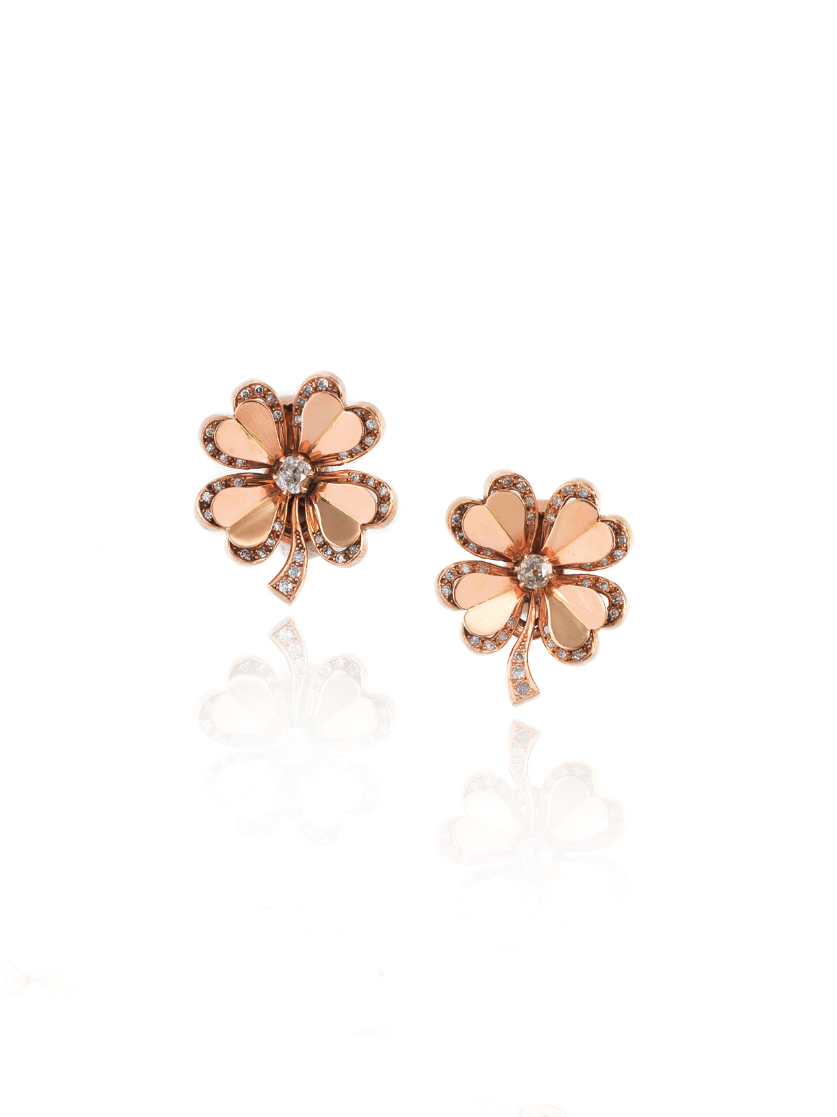 PAIO DI ORECCHINI IN ORO ROSA E DIAMANTI disegnato come un quadrifoglio con petali e stelo decorati in brillanti, al centro un diamante taglio vecchio, punzone francese d'importazione, diam. cm 2,5 PAIR OF CLOVERLEAF EARRINGS IN ROSE GOLD AND DIAMONDS
