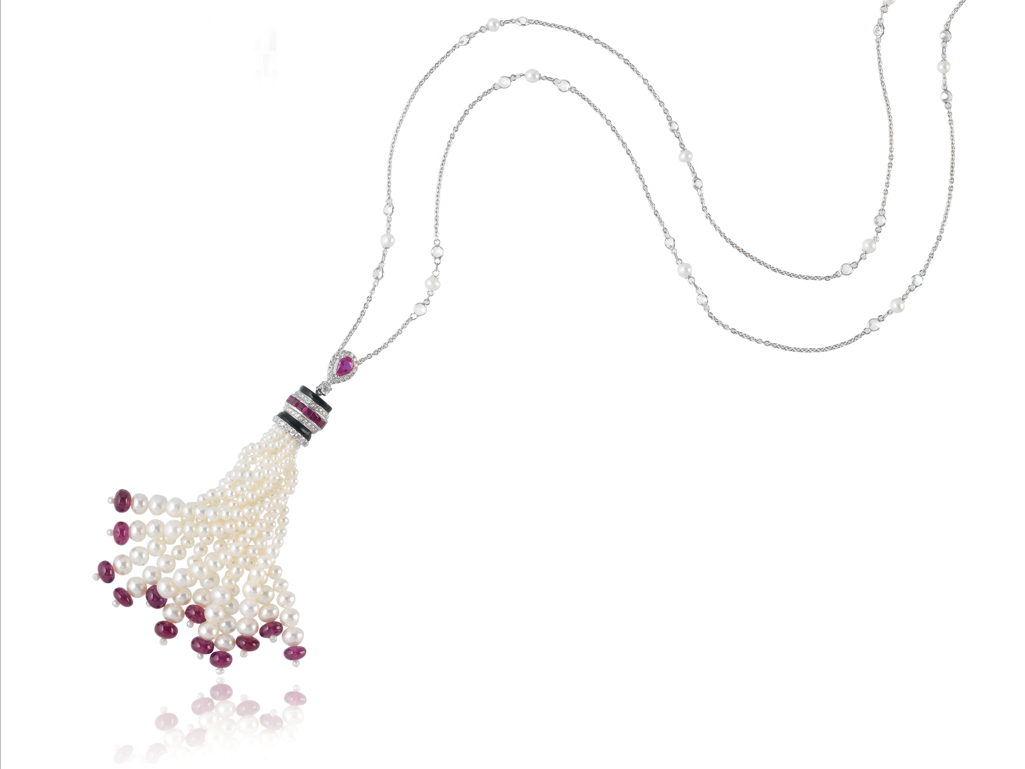 PENDENTE IN ORO BIANCO, RUBINI, PERLE, ONICE, DIAMANTI E TOPAZI pendente composto di rubino a goccia entro corolla in brillanti, elemento in onice, rubini carré e brillanti, finale a nappa in perle, rubini beads e rondelle diamantate, lungh. cm 8,5; corredato di lunga catena in oro bianco a maglia sottile intercalata da topazi incolori e piccole perle, punzone 750, lungh. cm 90 RUBIES, PEARLS, ONIX AND DIAMONDS PENDANT WITH LONG WHITE GOLD, PEARLS AND COLOURLESS TOPAZ CHAIN