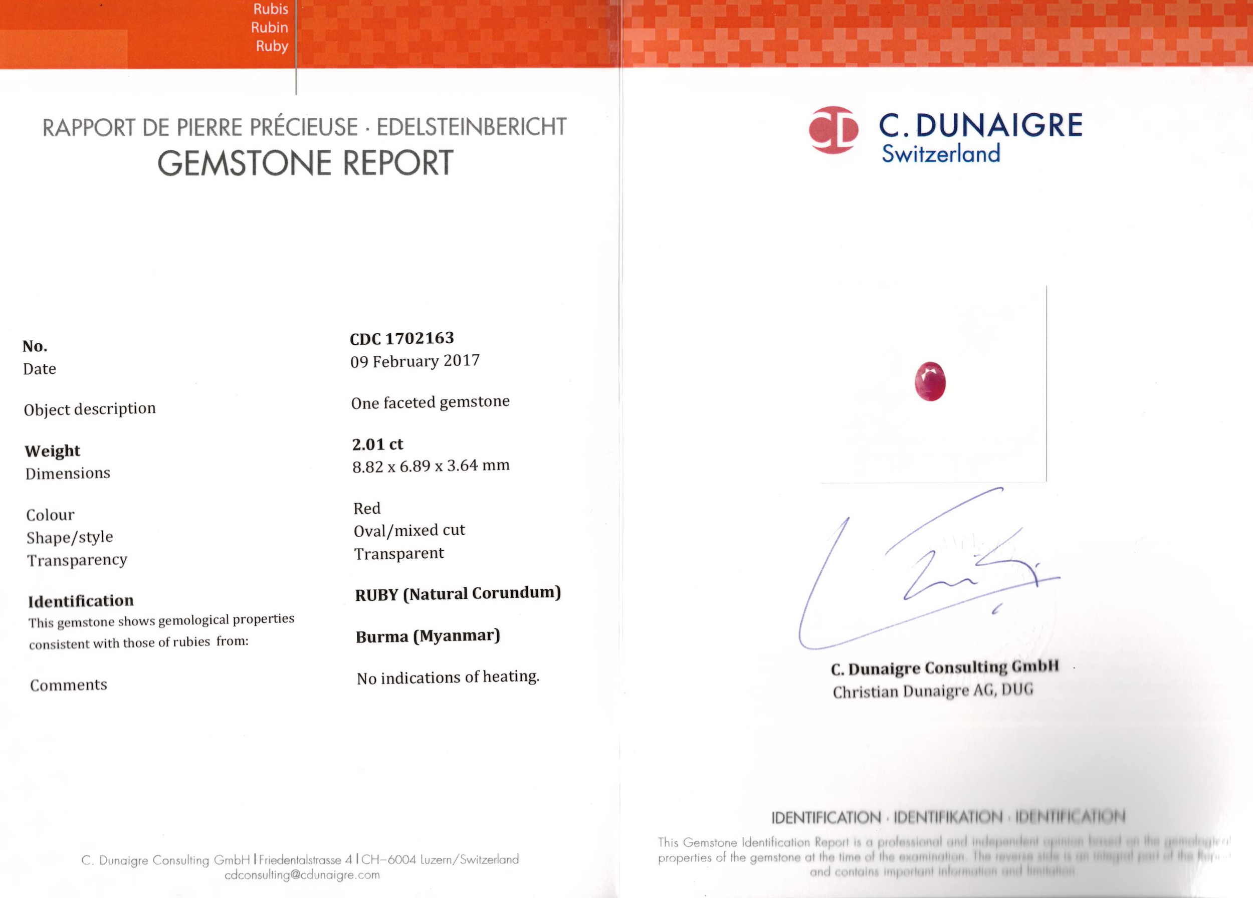 ANELLO IN ORO BIANCO, RUBINO BIRMANO NATURALE E DIAMANTI al centro un rubino Birmano naturale taglio ovale di ct 2.01 entro montatura decorata a pavé di diamanti, punzone 750, mis. 14 corredato di certificato C. DUNAIGRE n. CDC1702163 datato 02/2017, che attesta l'origine Birmana e l'assenza di trattamenti del rubino NATURAL BURMA RUBY, DIAMONDS AND WHITE GOLD RING