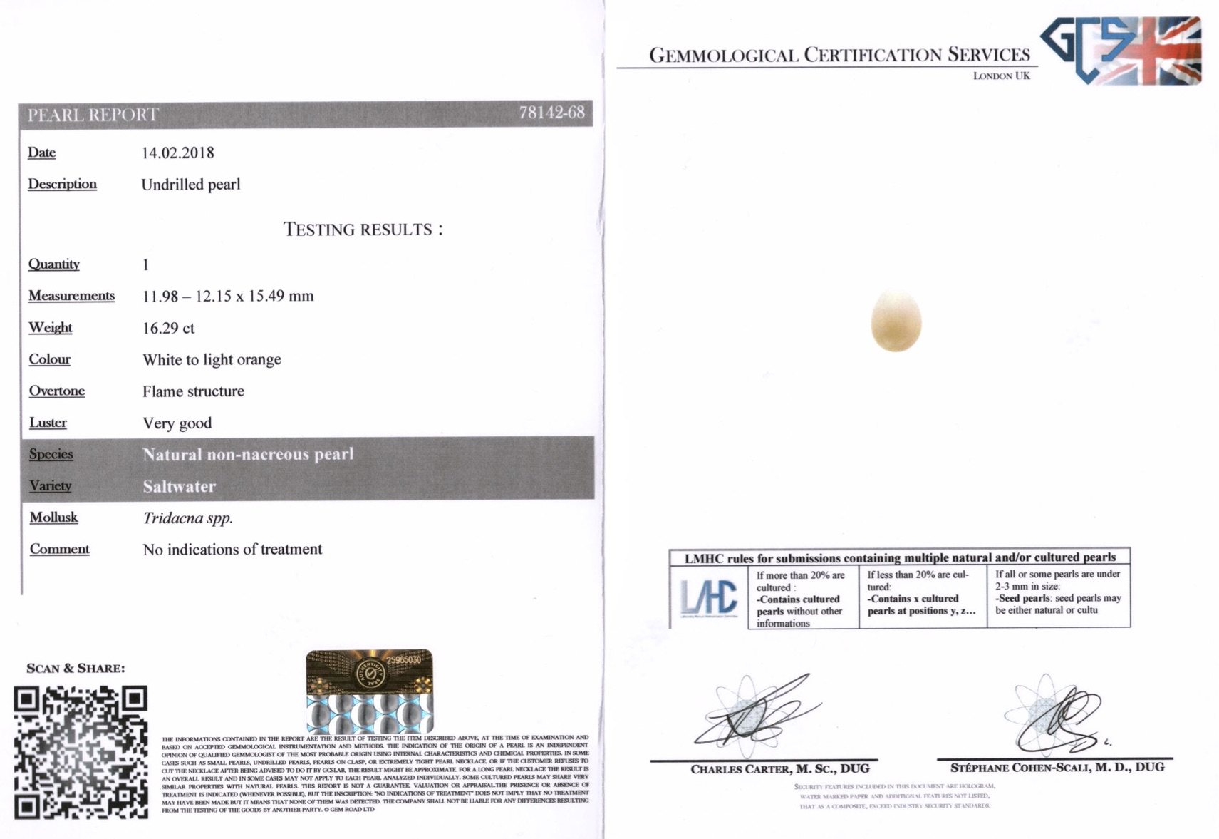 PENDENTE IN PLATINO, PERLA CONCH NATURALE E DIAMANTI, INIZI SEC. XX composto di una perla conch a goccia non forata di mm 11,98-12,15x15,49 entro montatura decorata in diamanti, lungh. cm 2,5 corredata di certificato GCS n. 78142-68 datato 02/2018 che attesta l’origine naturale d’acqua salata della perla NATURAL CONCH PEARL, DIAMONDS AND PLATINUM PENDANT, EARLY 20TH CENTURY