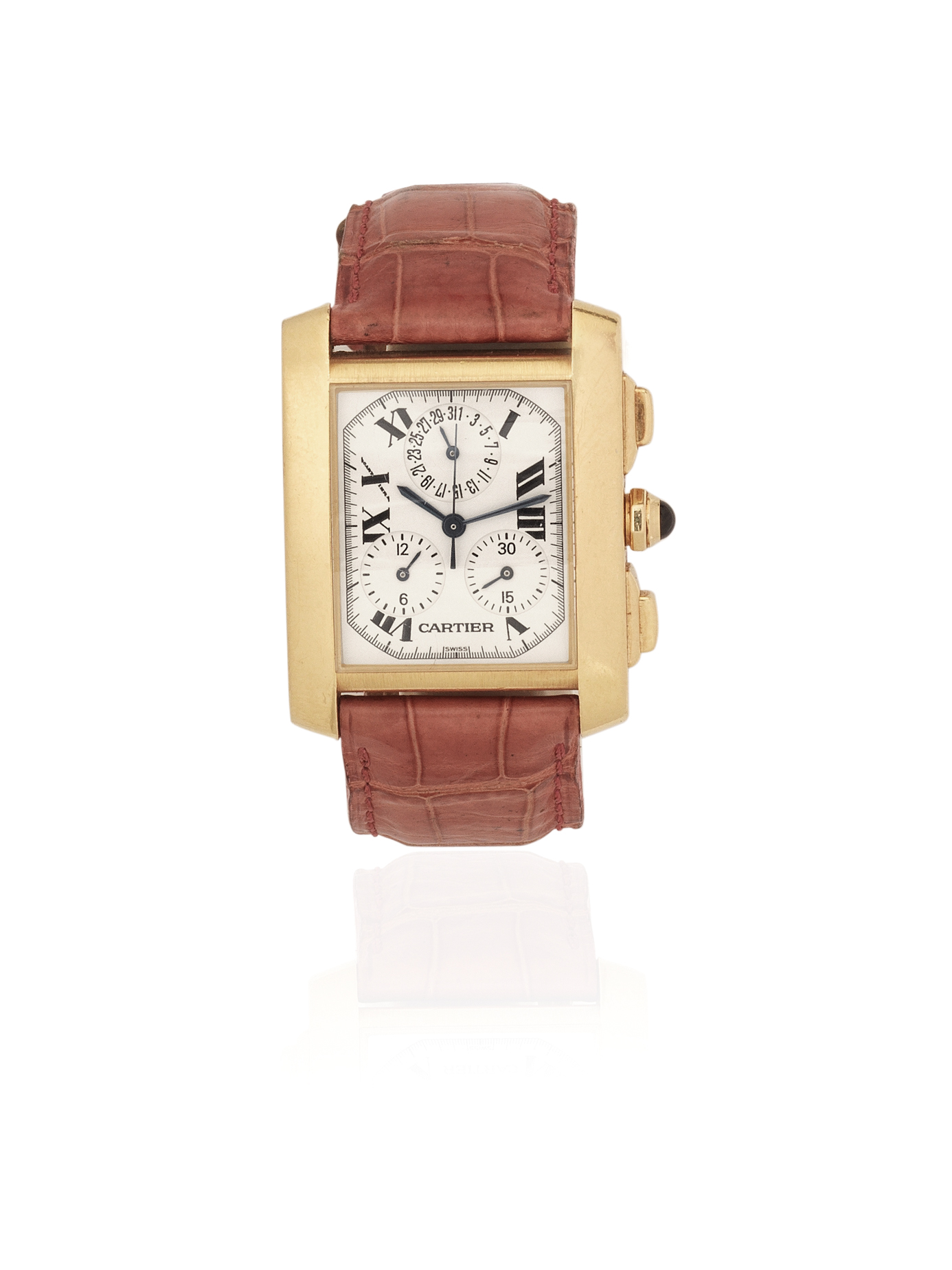 CARTIER, TANK FRANÇAISE, REF. 1830, CASSA N. MG261416, PRODOTTO NEL 2000 CIRCA OROLOGIO DA POLSO IN ORO GIALLO CON CRONOGRAFO, DATARIO, MOVIMENTO AL QUARZO E FIBBIA IN ORO CARTIER CASSA: rettangolare in due corpi da profilo incurvato in oro lucido e satinato, fondello chiuso da quattro viti, pulsanti cronografici rettangolari, corona decorata da zaffiro cabochon, vetro zaffiro QUADRANTE: argentè mat con numeri romani radiali e firma segreta a ore 10, tre quadranti ausiliari per data e contatori delle 12 ore e dei 30 minuti, lancette a spada blu, secondi cronografici al centro MOVIMENTO: al quarzo, calibro 212P, movimento n. 9'661'.020 Cassa, quadrante e movimento firmati DIMENSIONI: mm 36x28 CARTIER, TANK FRANÇAISE, REF. 1830, CASSA N. MG261416, MADE CIRCA 2000 A 18 K GOLD RECTANGULAR QUARTZ CHRONOGRAPH WRISTWATCH WITH DATE AND GOLD CARTIER BUCKLE Dial, case and movement signed DIM: 36x28 mm