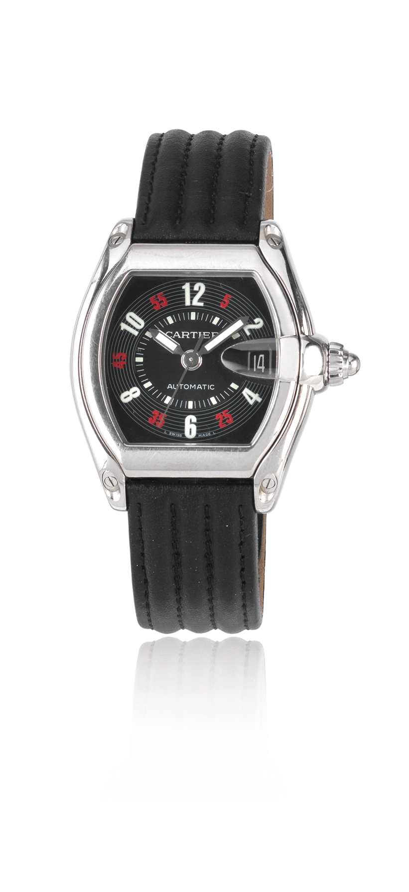 CARTIER, ROADSTER ‘LAS VEGAS’, REF. 2510, CASSA N. 697’129 CD, PRODOTTO NEL 2002 CIRCA OROLOGIO DA POLSO AUTOMATICO, IMPERMEABILE, IN ACCIAIO, CON DATARIO A RIMESSA RAPIDA E CHIUSURA DEPLOYANTE CARTIER CASSA: tonneau in tre corpi in acciaio lucido, fondello chiuso da otto viti, vetro zaffiro QUADRANTE: Las Vegas, fondo nero con numeri arabi in materiale luminescente e rossi, datario a ore 3, lancette a bastone con inserto in materiale luminescente, secondi al centro MOVIMENTO: meccanico a carica automatica Cassa, quadrante e movimento firmati DIMENSIONI: mm 38X44 CARTIER ROADSTER ‘LAS VEGAS’, REF. 2510, N. 697’129 CD, CIRCA 2002 TONNEAU SHAPED, SELF WINDING, CENTER SECONDS, STAINLESS STEEL WRISTWATCH WITH DATE AND A CARTIER DEPLOYANT CLASP Case, dial, and movement signed