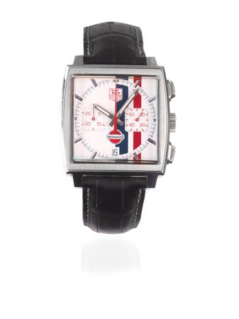 TAG HEUER, MONACO VINTAGE, REF. CW2118, N. LK4278, LIMITED EDITION, N. 3313/4000, 2006 CIRCA OROLOGIO DA POLSO IN ACCIAIO, IMPERMEABILE, AUTOMATICO, CON CRONOGRAFO, DATARIO E FIBBIA DEPLOYANT TAG HEUER, CORREDATO DI SCATOLA, GARANZIA E LIBRETTO DI ISTRUZIONI CASSA: a cuscino in due corpi in acciaio lucido e satinato, fondello chiuso da quattro viti, pulsanti cronografici ottagonali, vetro plastica QUADRANTE: bianco con righe verticali in blu e rosso, indici applicati a bastone, contatori per i secondi continui e per i 30 minuti, apertura per la data, lancette a bastone luminose, lancetta dei secondi cronografici rossa al centro MOVIMENTO: meccanico a carica automatica, calibro 17 Cassa, quadrante e movimento firmati DIMENSIONI: mm 46,5x38 TAG HEUER, MONACO VINTAGE, REF. CW2118, N. LK4278, LIMITED EDITION, N. 3313/4000, CIRCA 2006 A CUSHION- SHAPED, SELF-WINDING, WATER-RESISTANT, STAINLESS STEEL CHRONOGRAPH WRISTWATCH WITH REGISTERS, DATE AND A HEUER STEEL DEPLOYANT CLASP, Accompanied by the original box, Guarantee and instruction booklet Dial, case, movement and clasp signed DIM.: 46,5X38 mm