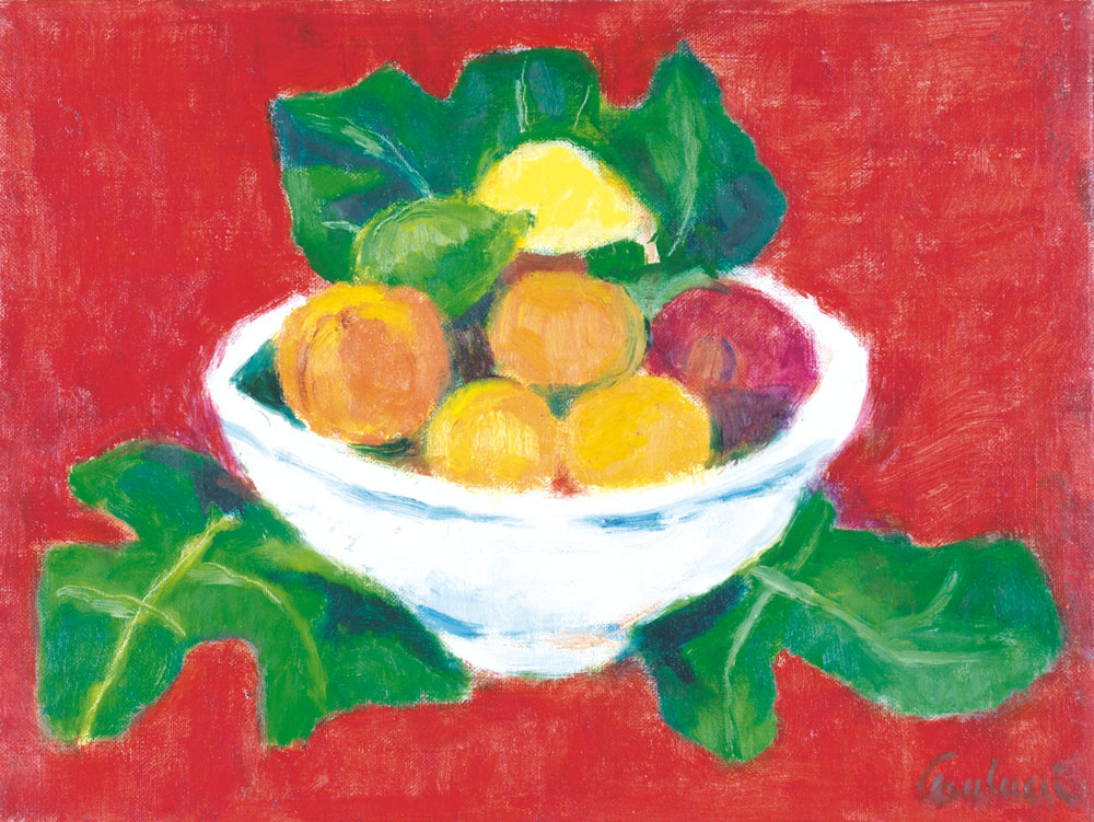 ENRICO PAULUCCI Genova 03/10/1901 - Torino 22/08/1999 - Natura morta su fondo rosso, anni '70, olio su tela cm. 30x40, firma in basso a destra, dichiarazione d'autenticità dell'artista e archivio a cura di Federico Riccio del 29/01/1999 su foto.