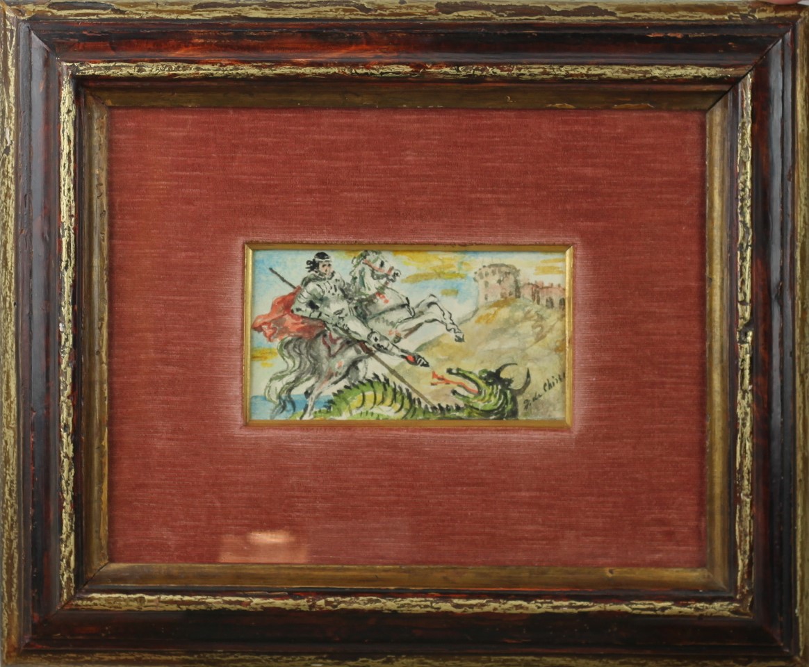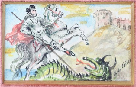 Giorgio De Chirico (Volo 1888 - Roma 1978) San Giorgio e il drago Anni 50 Dim.10,2x18,3 Acquerello su cartoncino Opera Archiviata al N.0077/10/05 OT presso la Fondazione Giorgio e Isa De Chirico in data 14/10/2005 Firmato in basso a dx