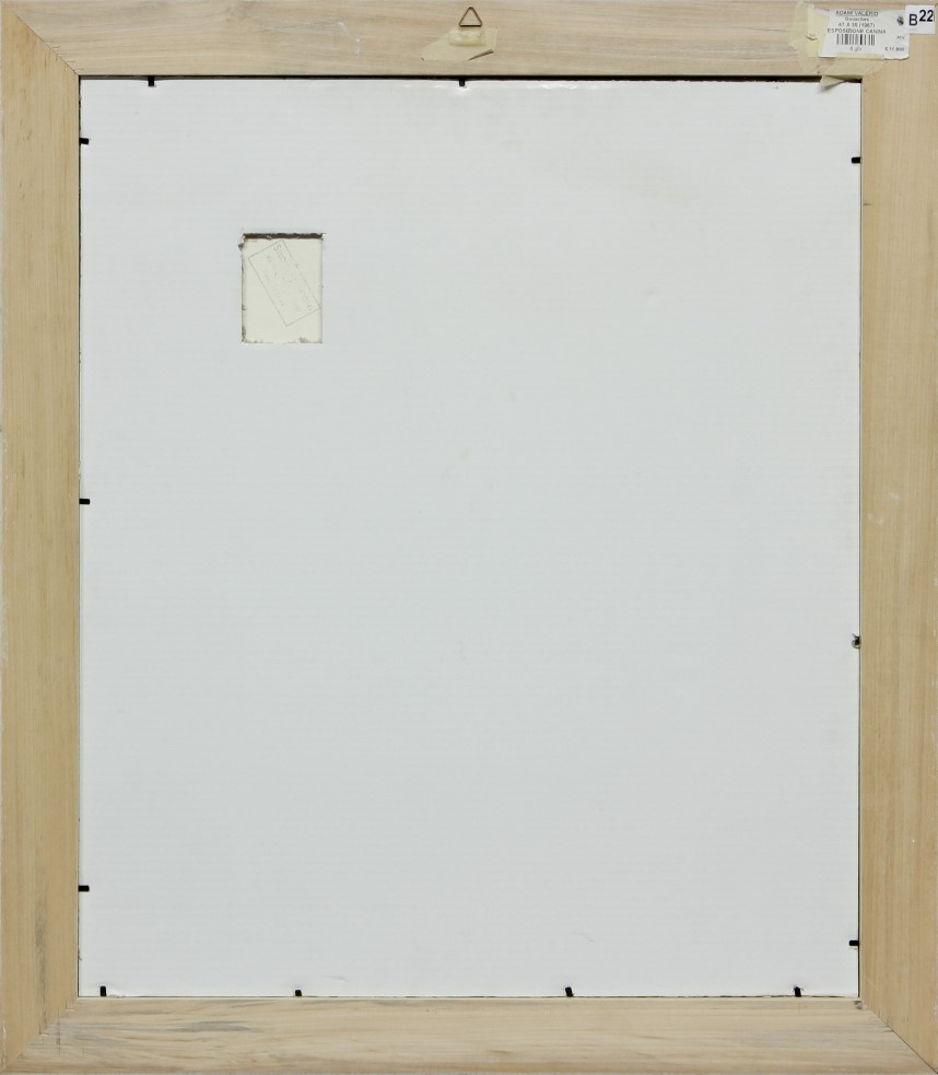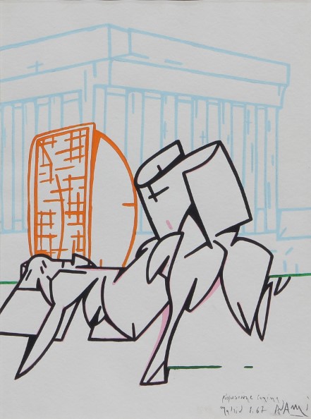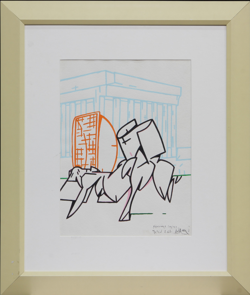 Valerio Adami (Bologna 1935) Esposizione canina 1967 Dim.47x35 Tecnica mista su cartoncino Autentica su foto dell’artista Titolo, firma e data in basso a dx