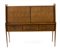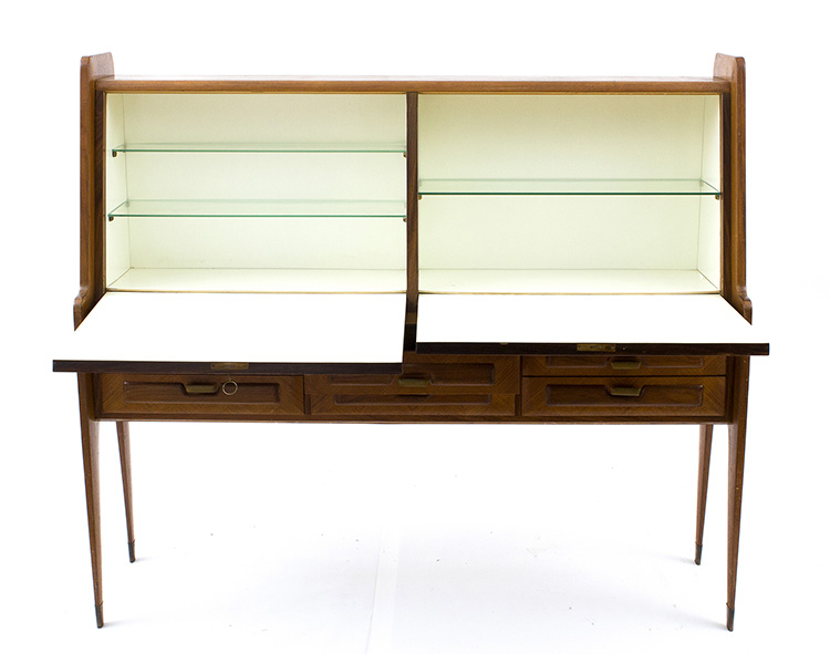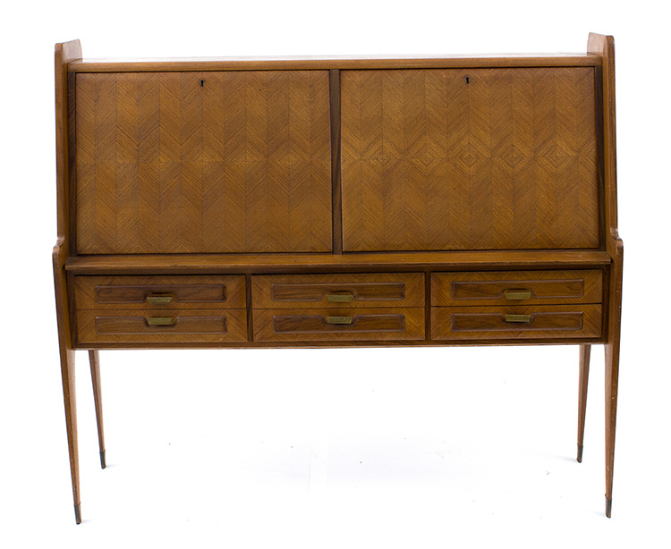 MANIFATTURA ITALIANA Mobile con doppia ribalta e sei cassetti frontali ; gambe di linea stilizzata, Anni ‘50 Legno con impiallacciatura a spina di pesce, 140 x 160,5 x 46 cm