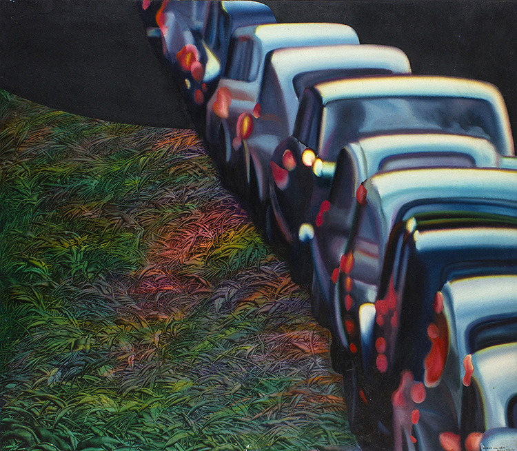 Ingorgo, 1968 Olio su tavola, 122 x 139 cm Dedica, firma e data in basso a destra: “A Dario con affetto”, Franco Mulas 68