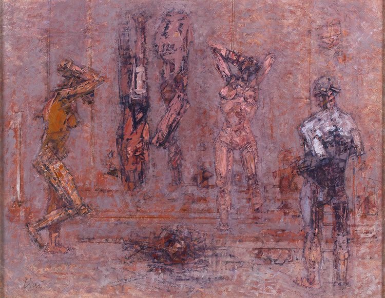 VALERIANO CIAIRoma, 1928 - Lariano, 2013 Interno con figure Matita e olio su...