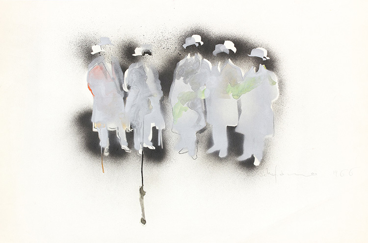 Homs (Libia), 1934 - Roma, 1998 I Futuristi, 1966 Tecnica mista su carta, 62 x 93 cm Firma e data in basso a destra: Schifano 1966