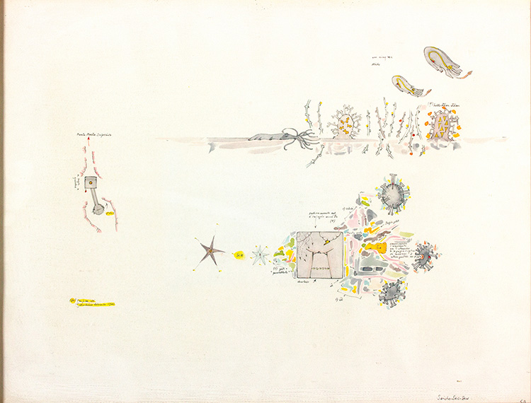 Titolo, firma e data al retro: Seiche, Sec, Sex, Gianfranco Baruchello, 1985/11