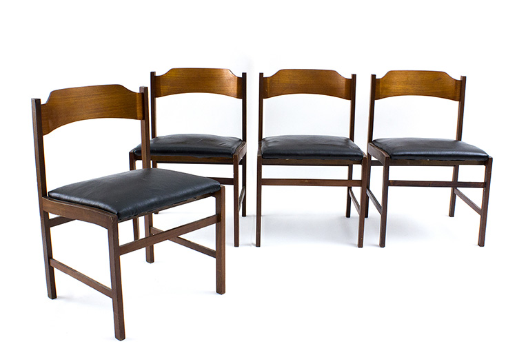 GIANCARLO FRATTINI (nello stile di) Quattro sedie con schienale a giorno e rivestimento in pelle nera, Anni ‘60 Legno, 74 x 47,5 x 45 cm circa