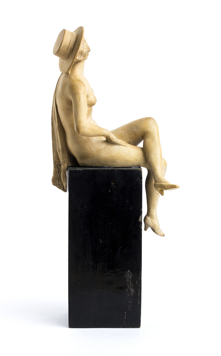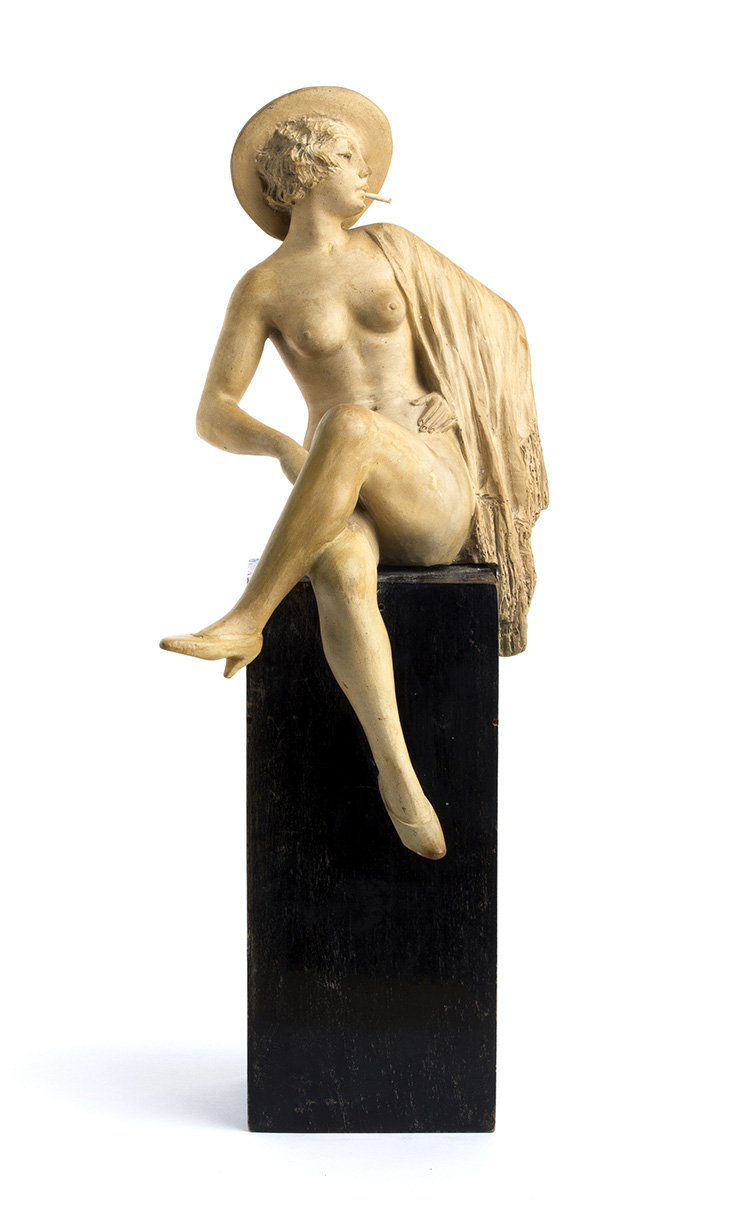 Campobasso, 1891 - Milano, 1953 Damina con cappello e sigaretta Terracotta e legno, h. 22 cm (h. 30 cm con la base) Firma al retro: A. Pannunzio