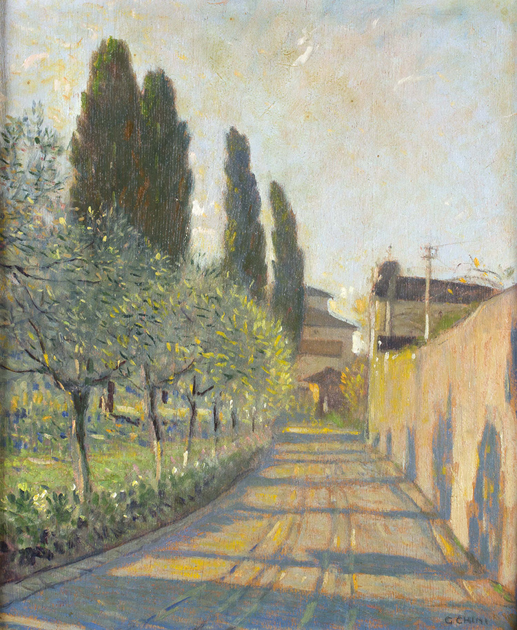 Firenze, 1873 - 1956 Una stradina vicino Firenze (Varlungo), 1930 Olio su tavola, 60,5 x 50 cm Firma in basso a destra: G. Chini