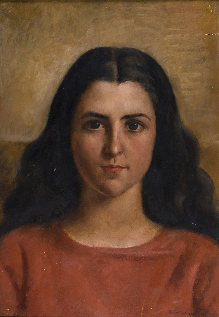 Bergamo, 1900 - Milano, 1964 Signora in rosso, Anni ‘50 Olio su tavola, 49,7 x 39,2 cm Firmato in basso a destra: Severino Bellotti