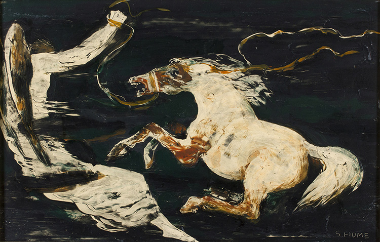 Comiso, 1915 - Milano, 1997 Il cavallo e il domatore Olio su tavola, 33 x 51,5 cm circa Firma in basso a destra: S. FIUME