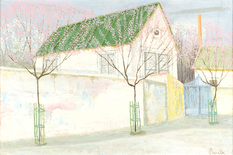 Roma, 1924 Primavera in periferia, 1959 Olio su tavola, 40 x 60 cm Firma in basso a destra: Buratti Firma, titolo e data al retro: Armando Buratti / Primavera in periferia / 1959