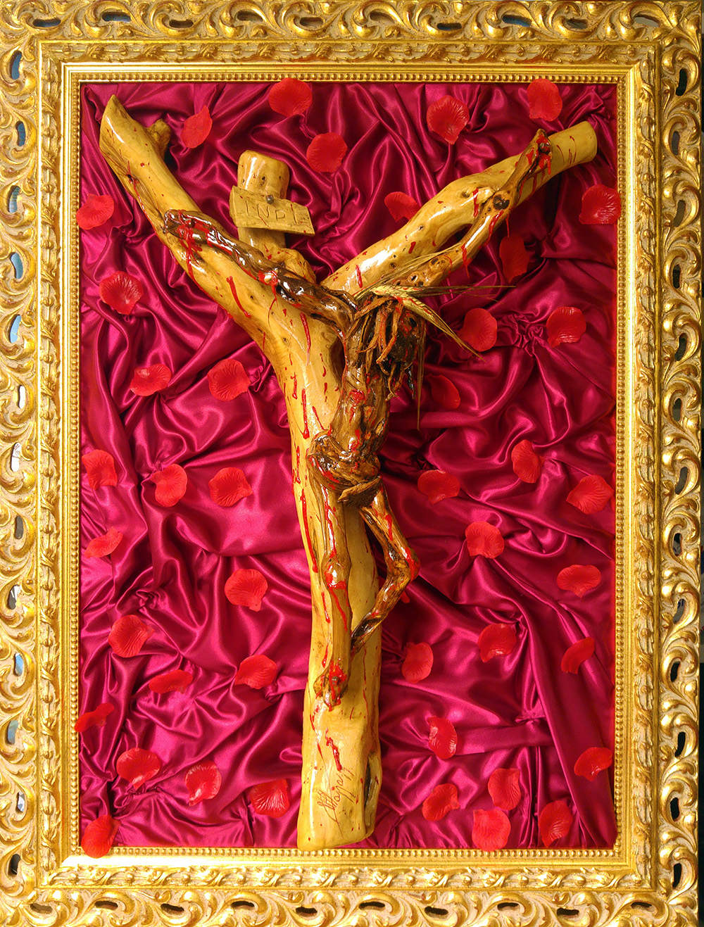 RAFFAELE MAZZA Ecce Homo scultura in legno, grano, ferro,raso,mistura cm 80x105x20