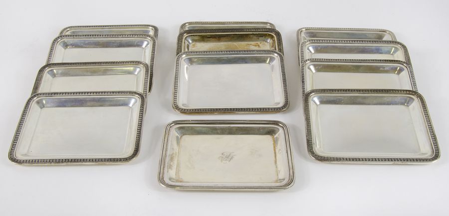 Lotto di 12 piatti rettangolari in argento. Gr. 1220.