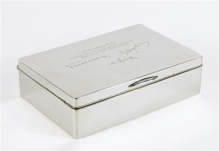 Scatola rettangolare in argento con coperchio inciso, interno in legno. Gr....