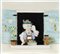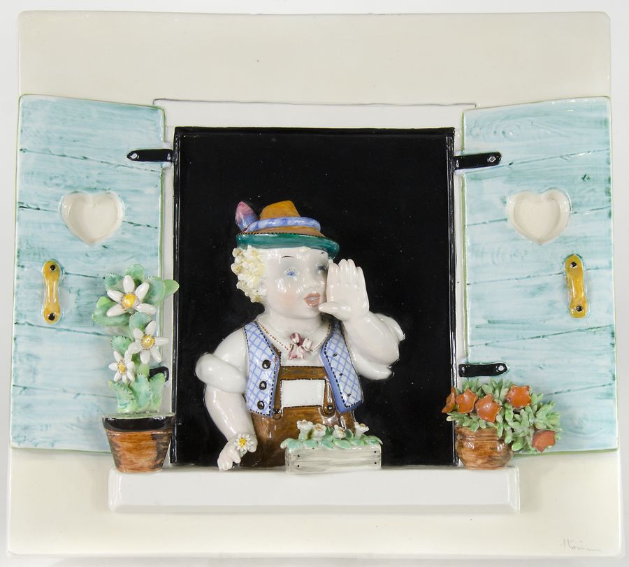 Tosin: piastra da parete in ceramica policroma raffigurante ragazzo alla finestra. Firmata b. a d. e al retro. cm. 33x37.