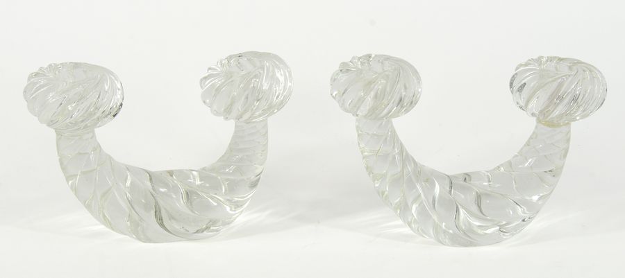 Paio di candelabri a 2 luci in vetro trasparente lavorato a onde. Lung. cm. 22. (uno difetto).
