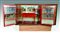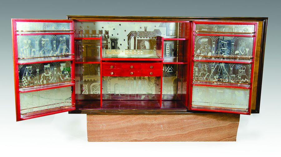 M. Claris: grande mobile bar in legno a 3 ante e 3 ripiani in legno dorato con medaglioni a motivi greci, interno in lacca rossa e fondo a specchio. cm. 135x200x40.