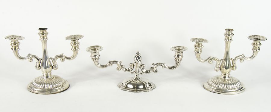 Lotto di 3 candelieri in argento di cui 2 in coppia a 3 luci. H. max cm. 19.